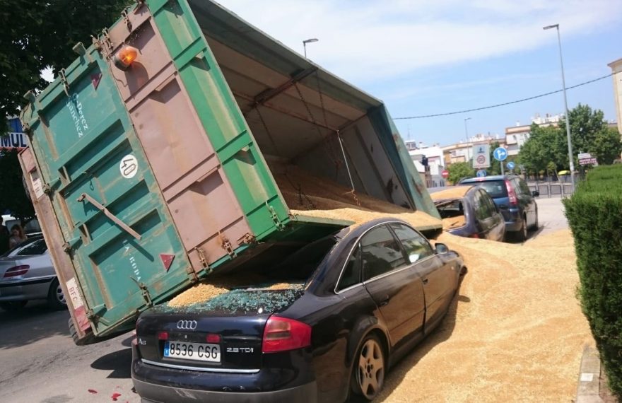 Un remolque cargado de trigo que circulaba por la Avenida del Ferrocarril ha volcado cayendo sobre al menos tres turismos aparcados en la vía pública y dejando su carga esparcida por la calle.