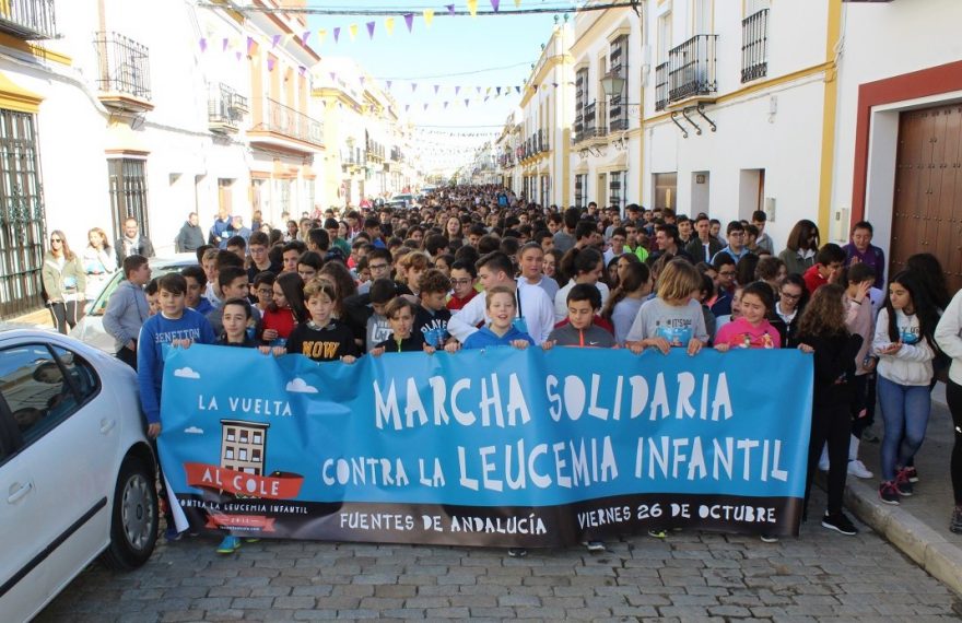 Convocados por los centros escolares, más de un millar de vecinos y vecinas de Fuentes de Andalucía han salido a la calle en una marcha benéfica, bajo el lema ‘La Vuelta al Cole contra la Leucemia Infantil’, con la que se inicia una campaña de sensibilización y recaudación de fondos para luchar contra esta enfermedad.