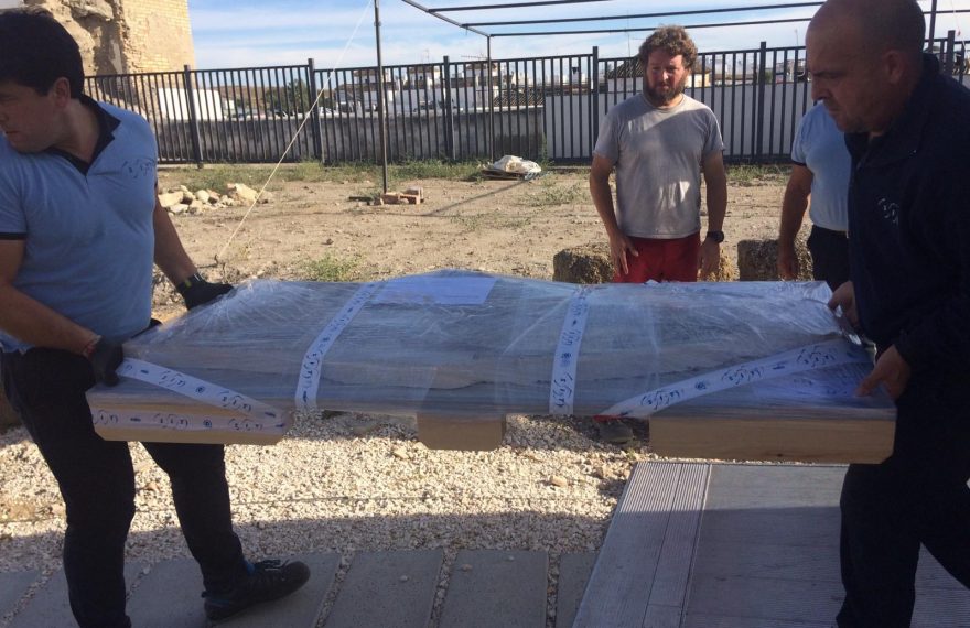Veinte de las treinta planchas en que se ha dividido el mosaico de ‘Los amores de Zeus’ han llegado esta tarde al yacimiento arqueológico de Plaza de Armas, el Picadero. El miércoles 16 llegarán las diez restantes y el próximo lunes empezará el montaje de las piezas en el lugar de exhibición del mosaico.