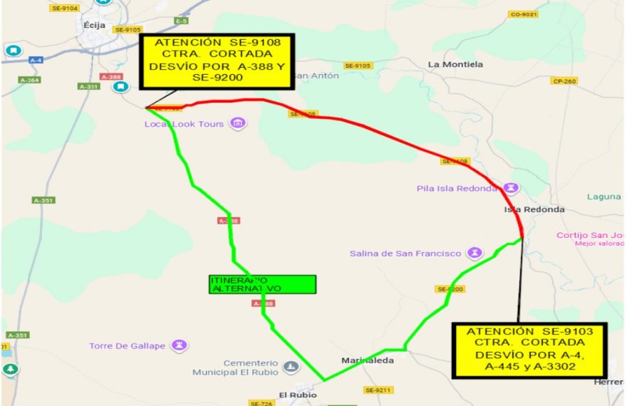La Diputación de Sevilla ha ampliado hasta el 29 de enero de 2026 el corte total de la carretera provincial SE-9108, que une Écija con Herrera, para ejecutar obras de mejora del drenaje. La vía permanece cerrada desde octubre, con desvíos alternativos señalizados.