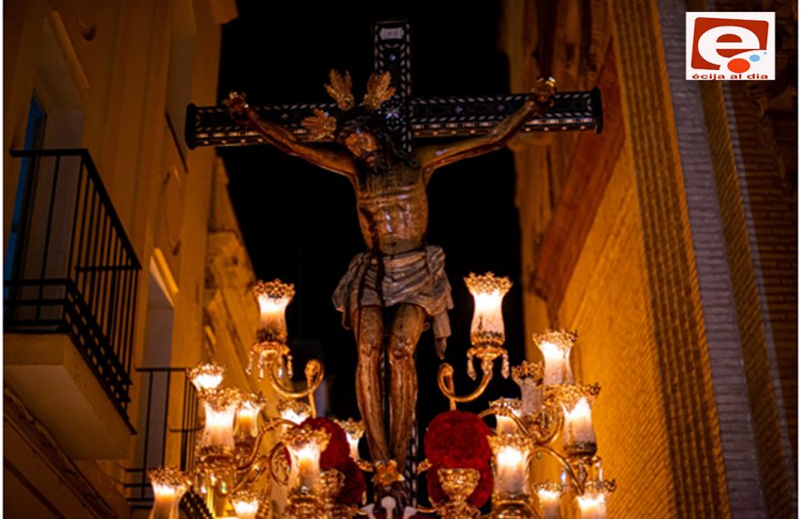 Descálzate, porque te adentras en terreno sacro alrededor de esta clavellina de leño carbonizado que marcha ante los crucificados de este mundo, ante el dolor de los inocentes, ante las vidas arrebatadas sin ningún sentido. Descálzate ante el prodigio muerto suspendido entre los guardabrisas del sol de Écija encarcelado. Colgadura enjoyada de sangre negra aterciopelada