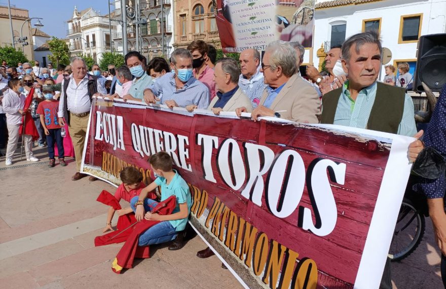 Unas 500 personas, según la Policía Nacional, se han concentrado en la Plaza de España, el Salón, convocados por la Plataforma Écija Quiere Toros, para reclamar la recuperación de la plaza de toros de Écija, cerrada desde hace prácticamente seis años.