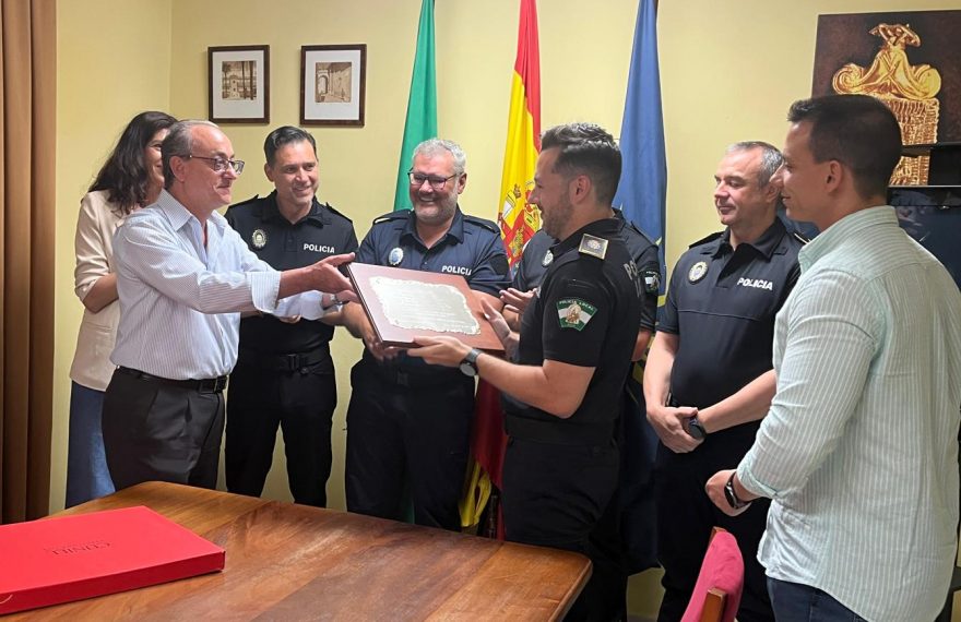 Antonio Martínez Romero, un vecino de Écija que sufrió un infarto el pasado 9 de abril, entregó una emotiva placa de agradecimiento a los cinco agentes de la Policía Local que le salvaron la vida.