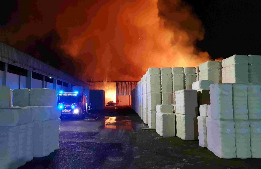 Los bomberos de cinco parques de la provincia trabajan desde esta madrugada en la extinción de un incendio declarado esta madrugada en una nave de algodón de Écija.