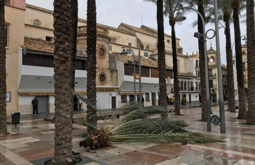 La copa de al menos una de las palmeras de la Plaza de España, El Salón, se ha desprendido a causa de las ráfagas de viento que desde el miércoles se registran en Écija y que han llegado a superar los 70 kilómetros por hora, según la Agencia Estatal de Meteorología (Aemet).