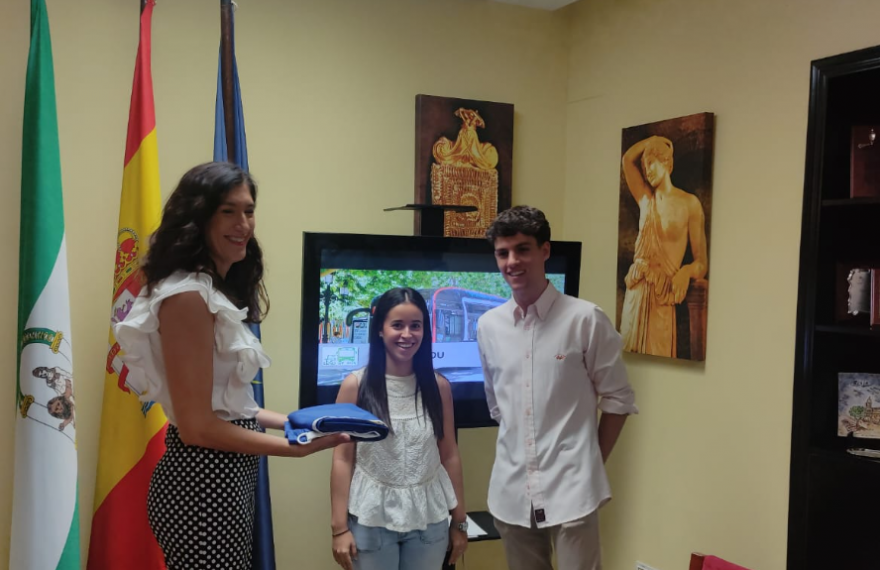 La alcaldesa de Écija, Silvia Heredia (PP), ha entregado la bandera de la ciudad a los alumnos de SAFA Écija que participan con su idea ‘Send by bus’ en la final europea de emprendimiento GEN-E, en la que representarán a España.