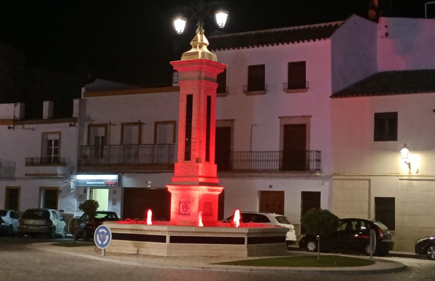 Monumentos ecijanos como el campanario de la iglesia de San Juan, la fuente de la plaza de Colón (en la foto) o los balcones largos del Palacio de Peñaflor se iluminaron anoche de color rojo para visibilizar a las personas que padecen el síndrome 22q11 o síndrome de DiGeorge.