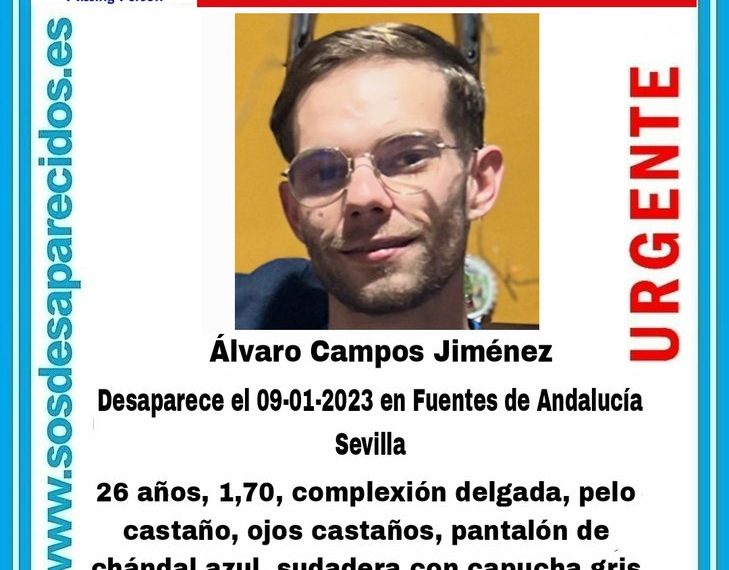 Fuentes de Andalucía busca a un joven de 26 años desaparecido desde el pasado 9 de enero. Se llama Álvaro Campos Jiménez, tiene 26 años de edad, y la última vez que se le vio vestía un pantalón de chándal azul y una sudadera con capucha gris.