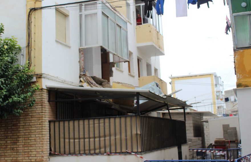 El desprendimiento de un balcón en un bloque de pisos en la barriada de El Valle ha obligado a realojar a dos familias, siete personas en total, entre las que se encuentran menores de edad.
